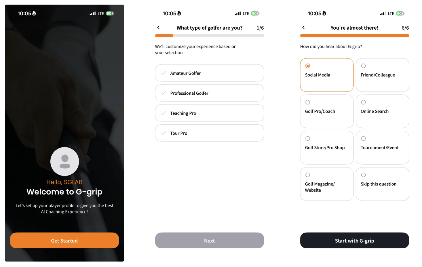 After completing the sign-up process, you can set up your profile. In the profile, you can select your golfer type, dominant hand, and gender. This information is used to enhance the AI coaching feature.