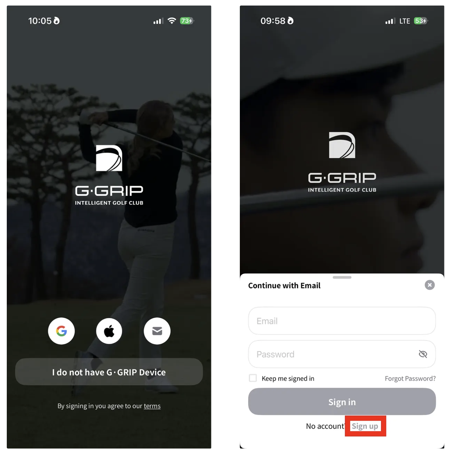 To use the Ggrip app, you can sign in via email, Google, or Apple account.